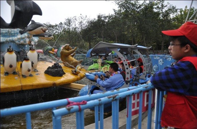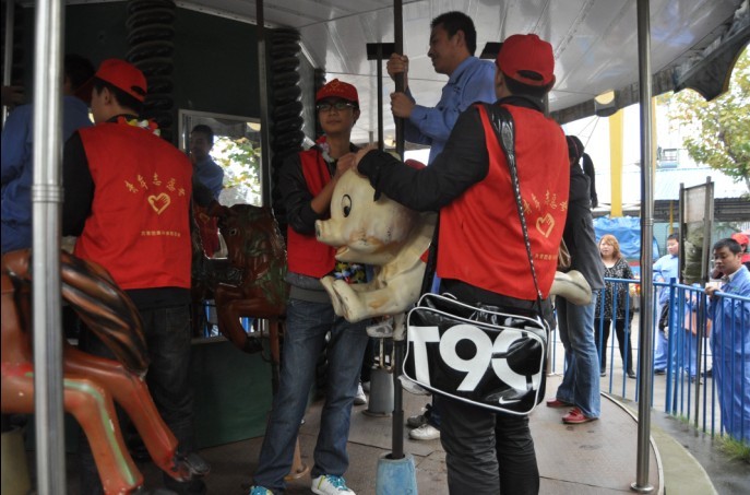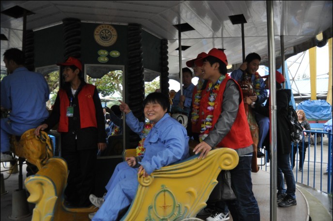 园友们在志愿者陪护下玩旋转木马(看园友们好开心呀,他们有的人从来没有去过公园哦)