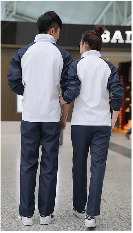经过学生代表的投票,确定如下款式。上衣主体白色,肩袖为深蓝色;裤子为深蓝色。