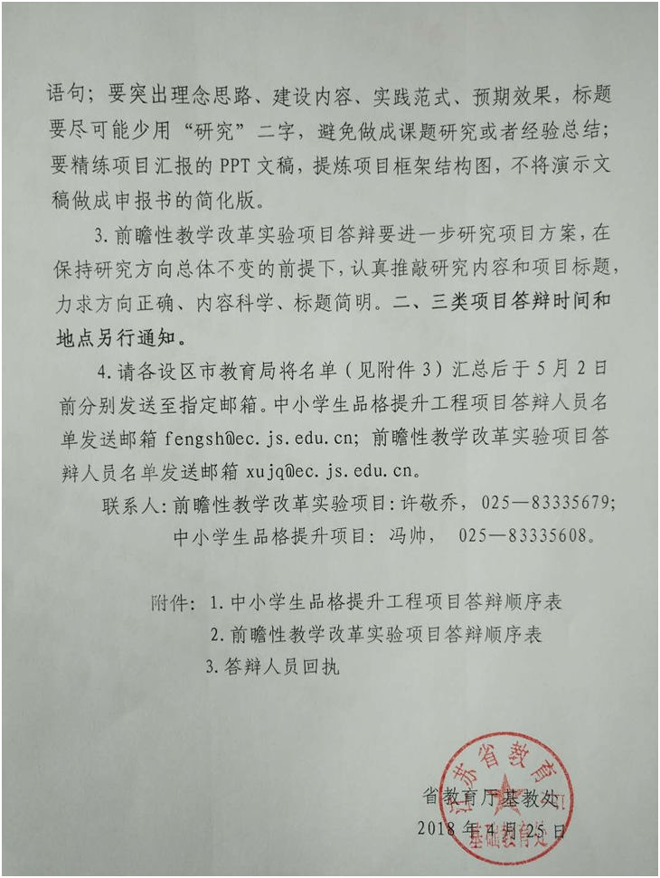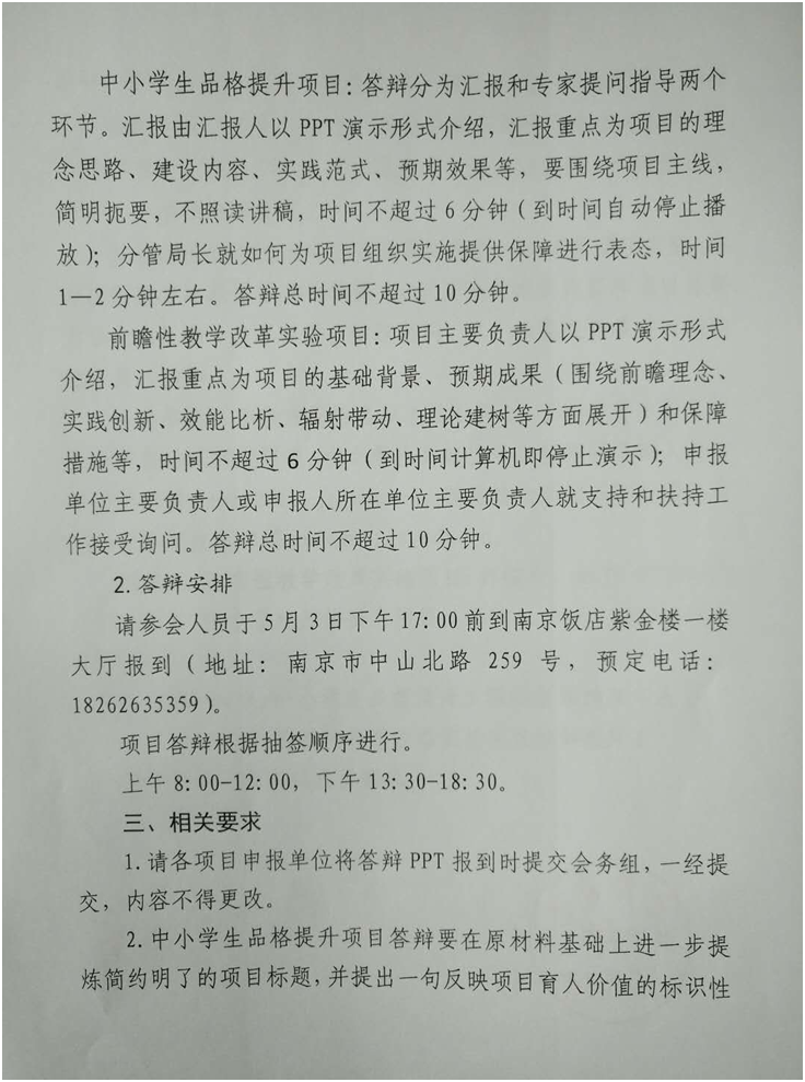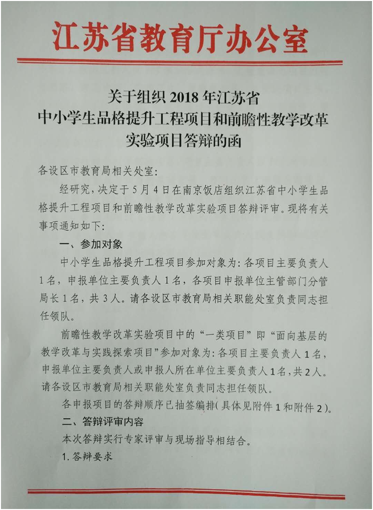 关于组织2018年江苏省中小学生品格提升工程项目和前瞻性教学改革实验项目答辩的函