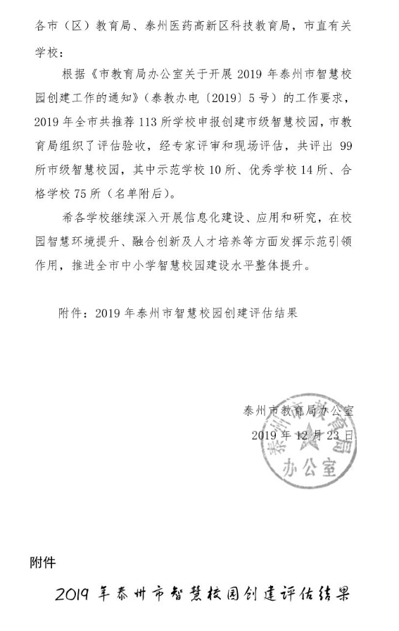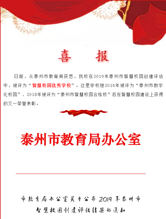 我校被评为2019年泰州市“智慧校园优秀学校”