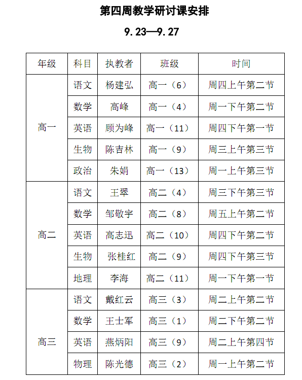 2019年秋第四周教学研讨课安排表