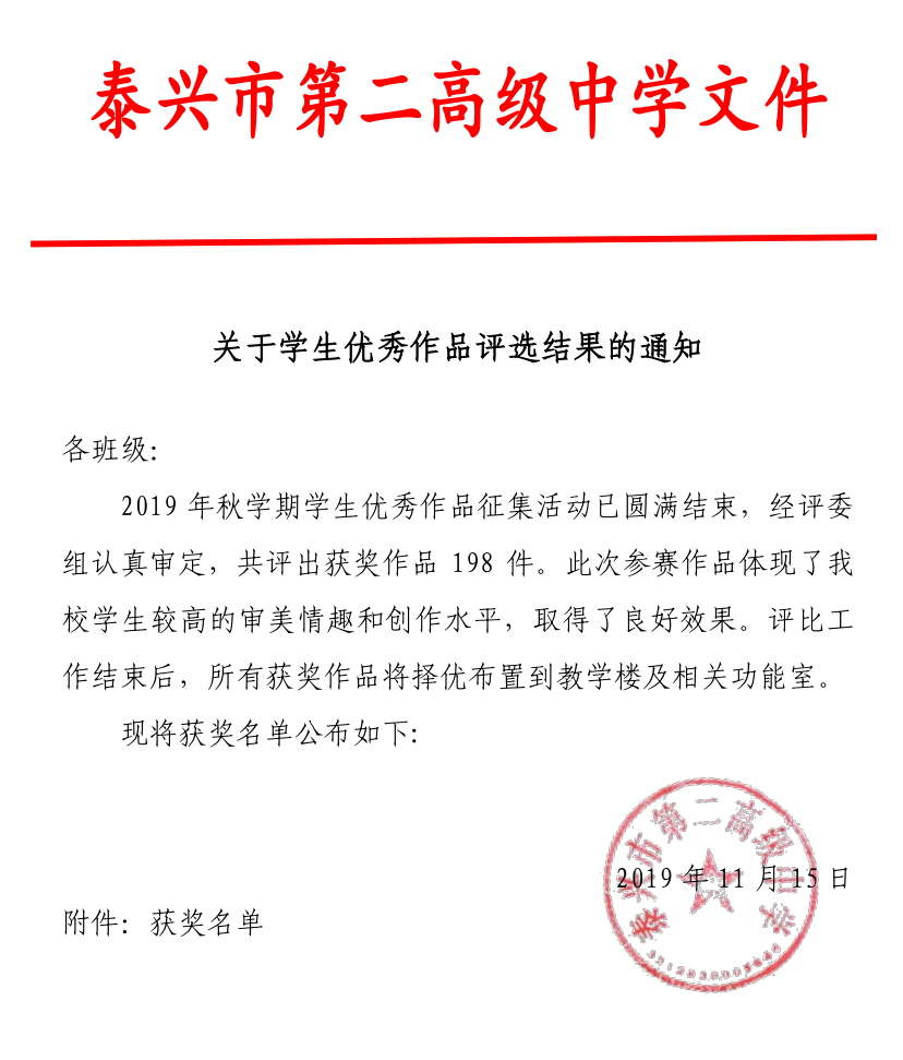 关于2019年秋学期学生优秀作品评选结果的通知