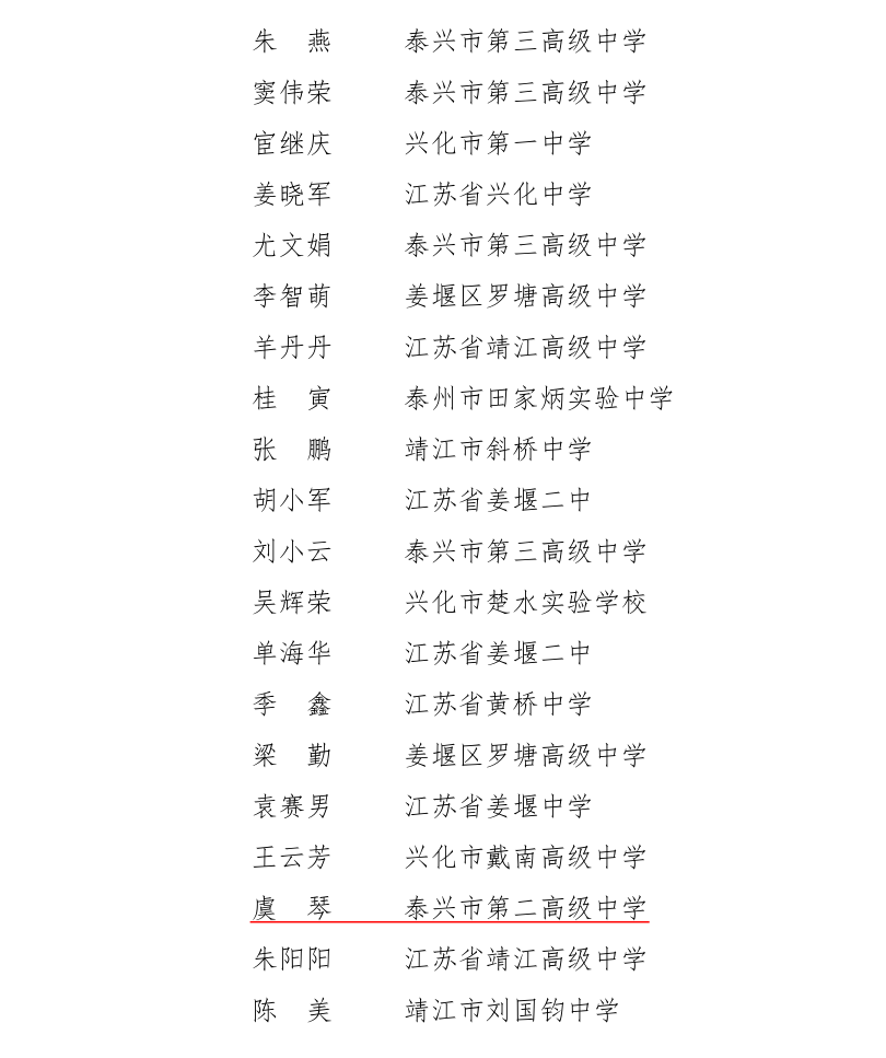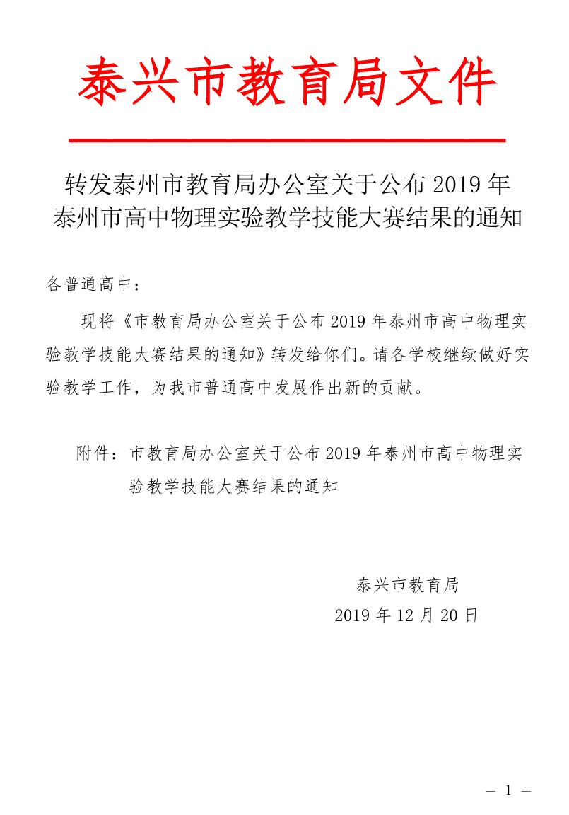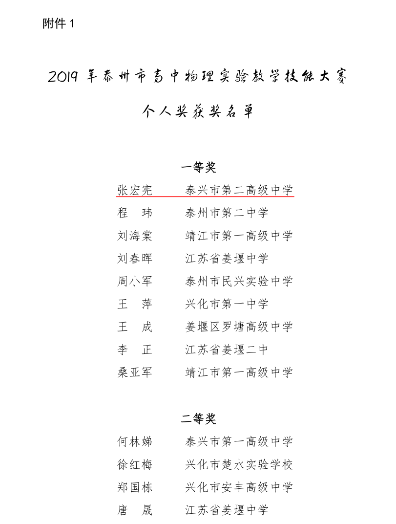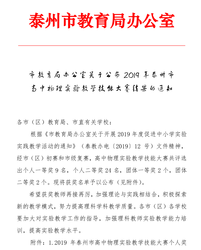 (张宏宪)公布2019年泰州市高中物理实验教学技能大赛结果的通知