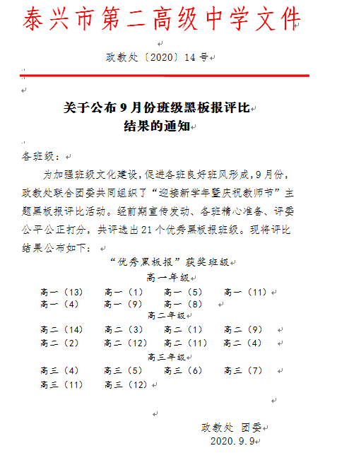 关于公布9月份班级黑板报评比结果的通知