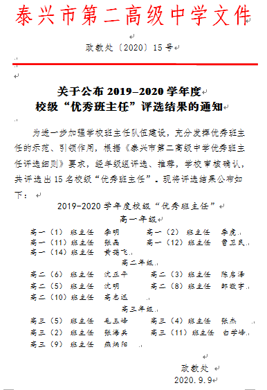 关于公布2019-2020学年度校级“优秀班主任”评选结果的通知