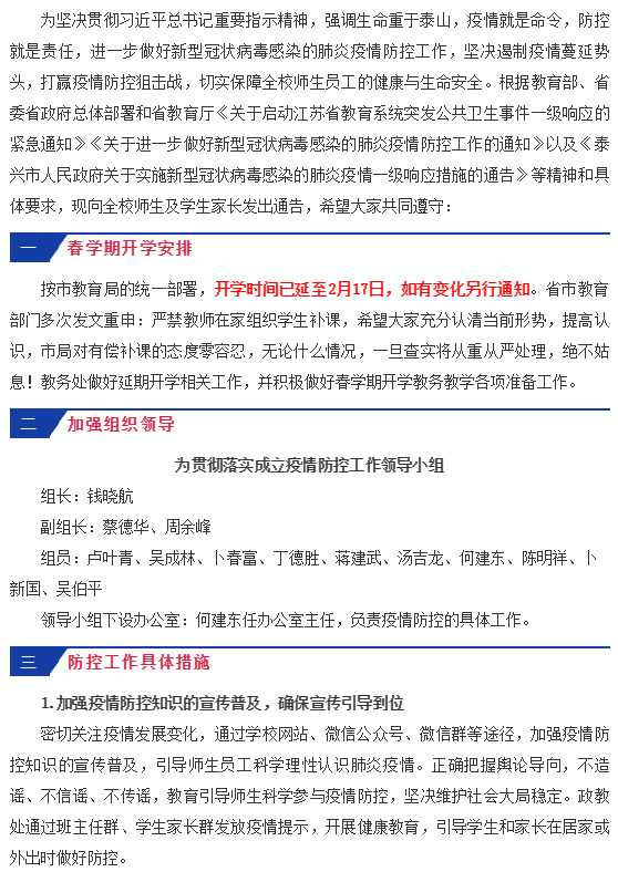 泰兴市第二高级中学关于进一步防控新型冠状病毒感染的肺炎疫情的通告