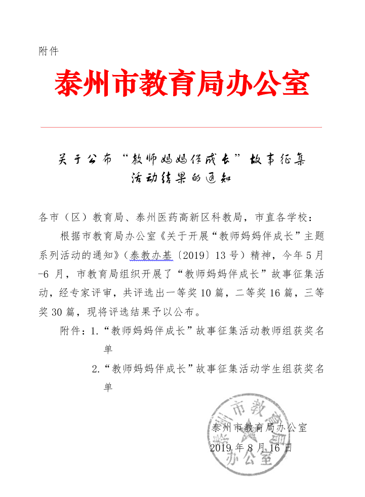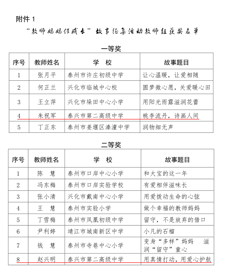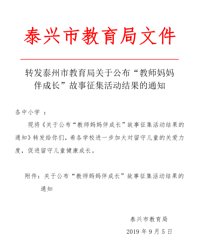(朱祝军 赵兴明)转发泰州市教育局关于公布“教师妈妈伴成长”故事征集活动结果的通