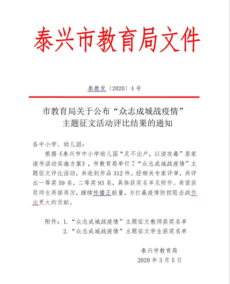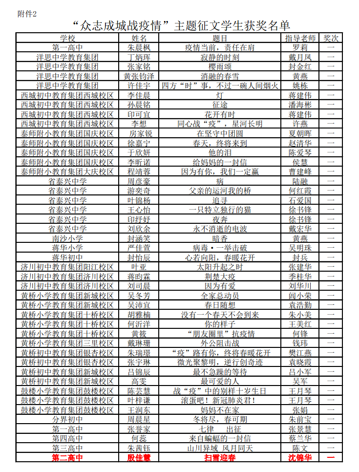 “众志成城战疫情”主题征文学生获奖名单(指导老师-沈锦华、卢叶青)