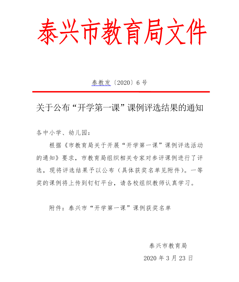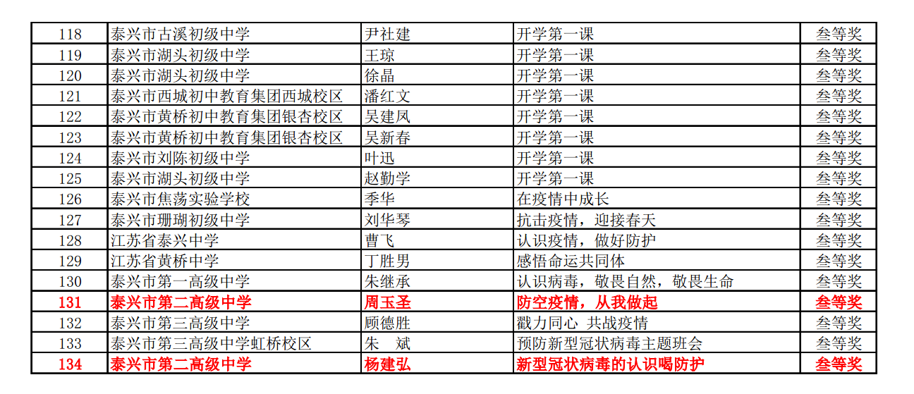 泰兴市“开学第一课”课例获奖名单(季虎、周玉圣、杨建弘)