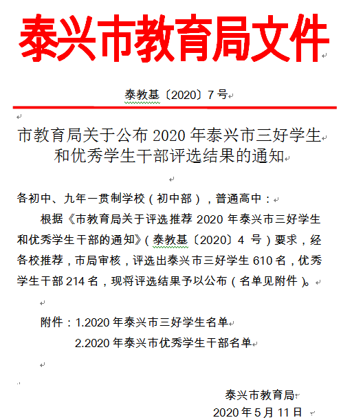 市局关于公布2020年泰兴市三好学生和优秀学生干部评选结果的通知
