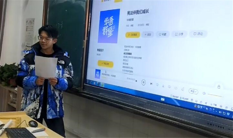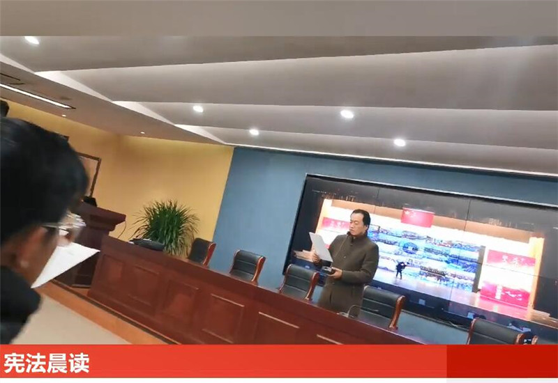 今年的“宪法晨读”活动与往年稍有不同,不仅体现在形式的多样性,而且表现在内容的趣味性和实效性。首先赵兴明带领同学们一起诵读了《宪法晨读内容》,在诵读中感悟宪法的庄严,在诵读中体会宪法赋予我们的权利和义务,在诵读中提升我们的精气神。接着大家共同观看了教育部开展的“宪法晨读”直播活动。当五星红旗冉冉升起时,当朗朗的诵读声响起时,当精彩的节目表演一一纷呈时,我们的灵魂仿佛刹那升华……