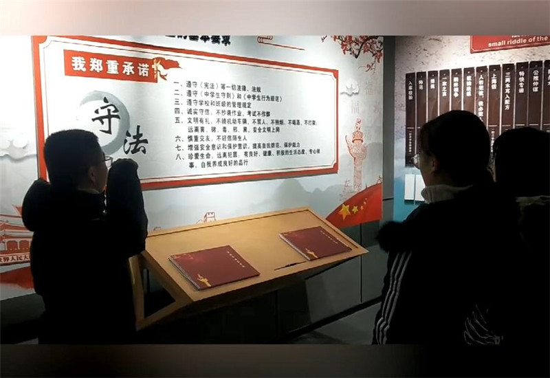 法治文化教育课程基地是泰兴二高的普法主阵地之一,它囊括了古今中外许多重大法制法规,以形式多样的图片、视频、游戏等项目,化繁为简,寄学习、娱乐为一体,把枯燥乏味的法律知识变成一个个生动形象的法治小故事。在带领大家参观学习学校法治文化课程基地时,政教处副主任赵兴明旁征博引,以历史的智慧和现实的案例向同学们展示了一个个美妙而又深邃的法治小天地。学生们在参观中感悟,在学习中升华。学生代表石康宁说:“通过此次参观学习,跨过时空隧道,我仿佛近距离感受了古今中外法治名人和伟人的谆谆教诲,他们的执著和崇高永远是我学习的榜样。”