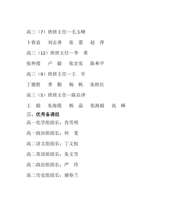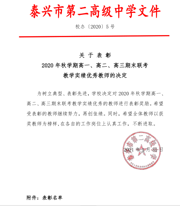 关 于 表 彰 2020年秋学期高一、高二、高三期末联考 教学实绩优秀教师的决定