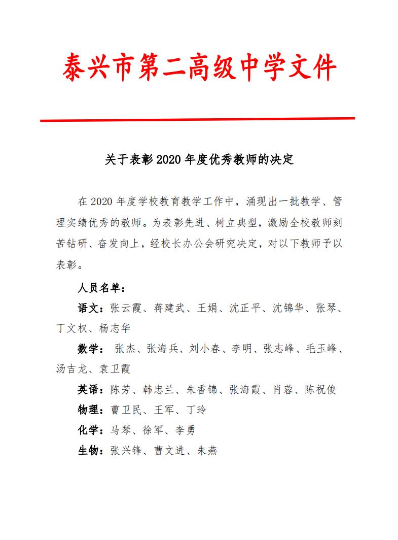 关于表彰 2020 年度优秀教师的决定