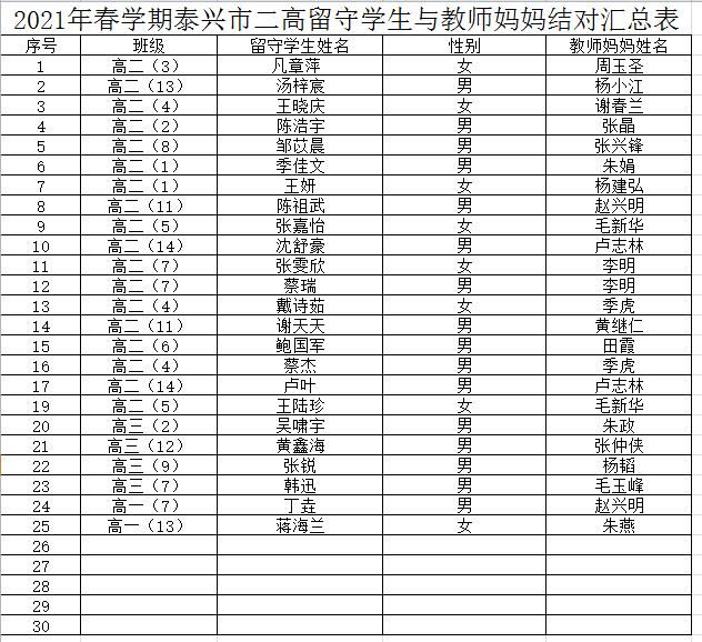 2021年春学期教师妈妈与留守学生结对汇总表