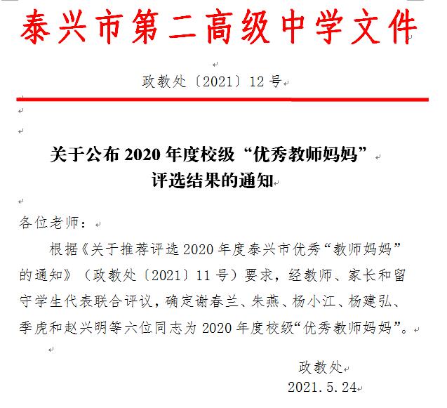 关于公布2020年度校级优秀“教师妈妈”评选结果的通知