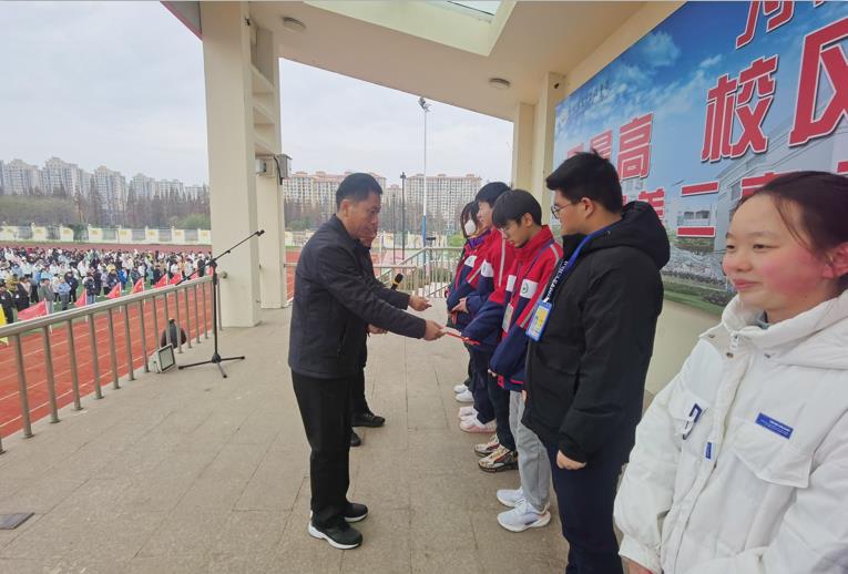 党总支书记、校长符凯为获得“一马当先”奖的同学颁奖。