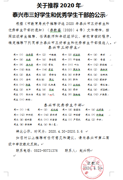关于推荐2020年泰兴市三好学生和优秀学生干部的公示