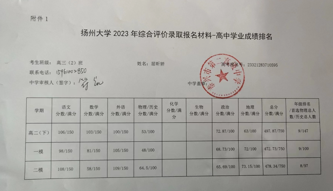 高三(2)班屈昕妍同学扬州大学2023综合素质评价录取报名材料公示