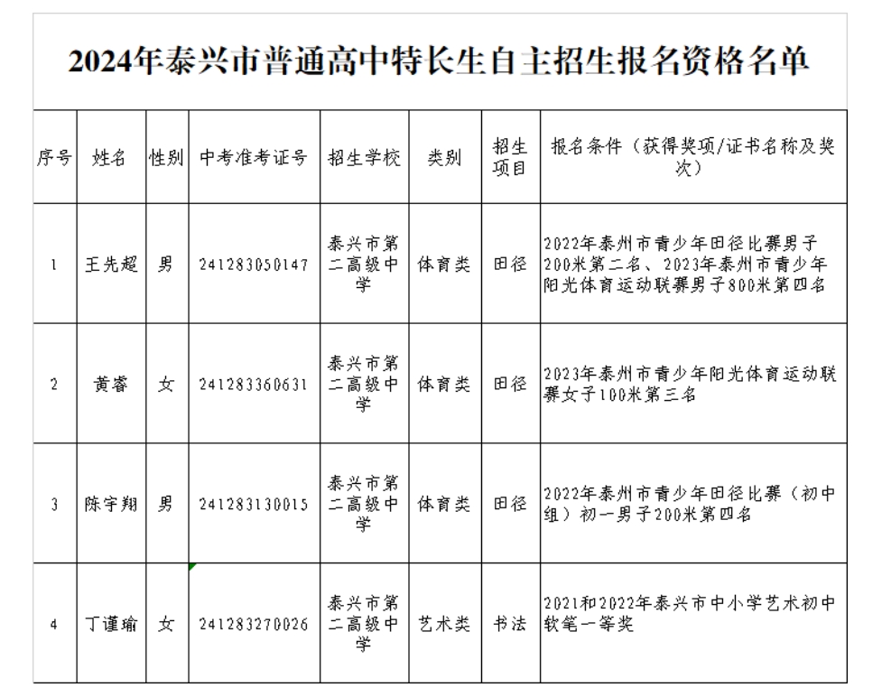 2024年泰兴市第二高级中学特长生报名资格名单公示